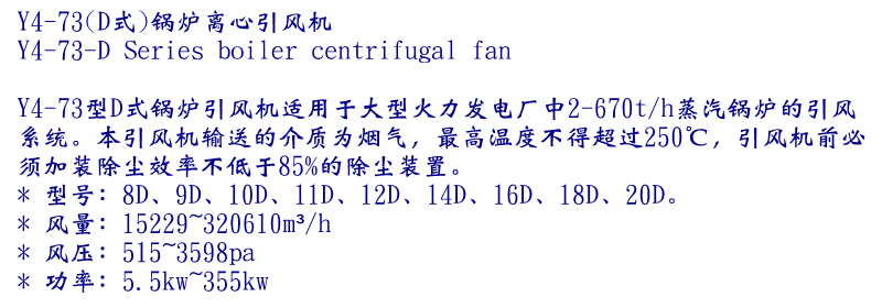 Y4-73型D式鍋爐引風機適用于大型火力發電廠中2-670t/h蒸汽鍋爐的引風系統。本引風機輸送的介質為煙氣,最高溫度不得超過250℃,引風機前必須加裝除塵效率不低于85%的除塵裝置。