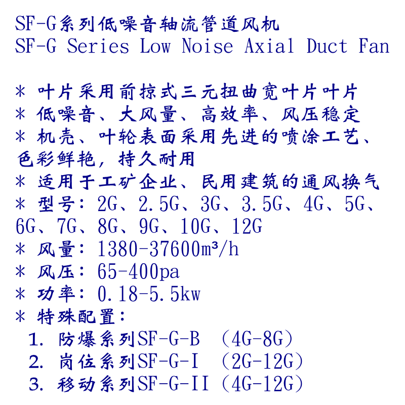 SF-G系列低噪音管道通風機,葉片采用前掠式三元扭曲寬葉片葉片,低噪音、大風量、高效率、風壓穩定,機殼、葉輪表面采用先進的噴涂工藝、色彩鮮艷,持久耐用,適用于工礦企業、民用建